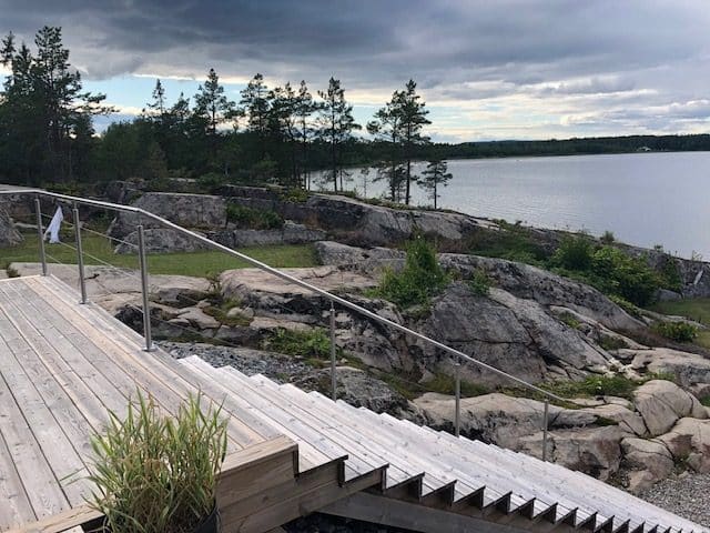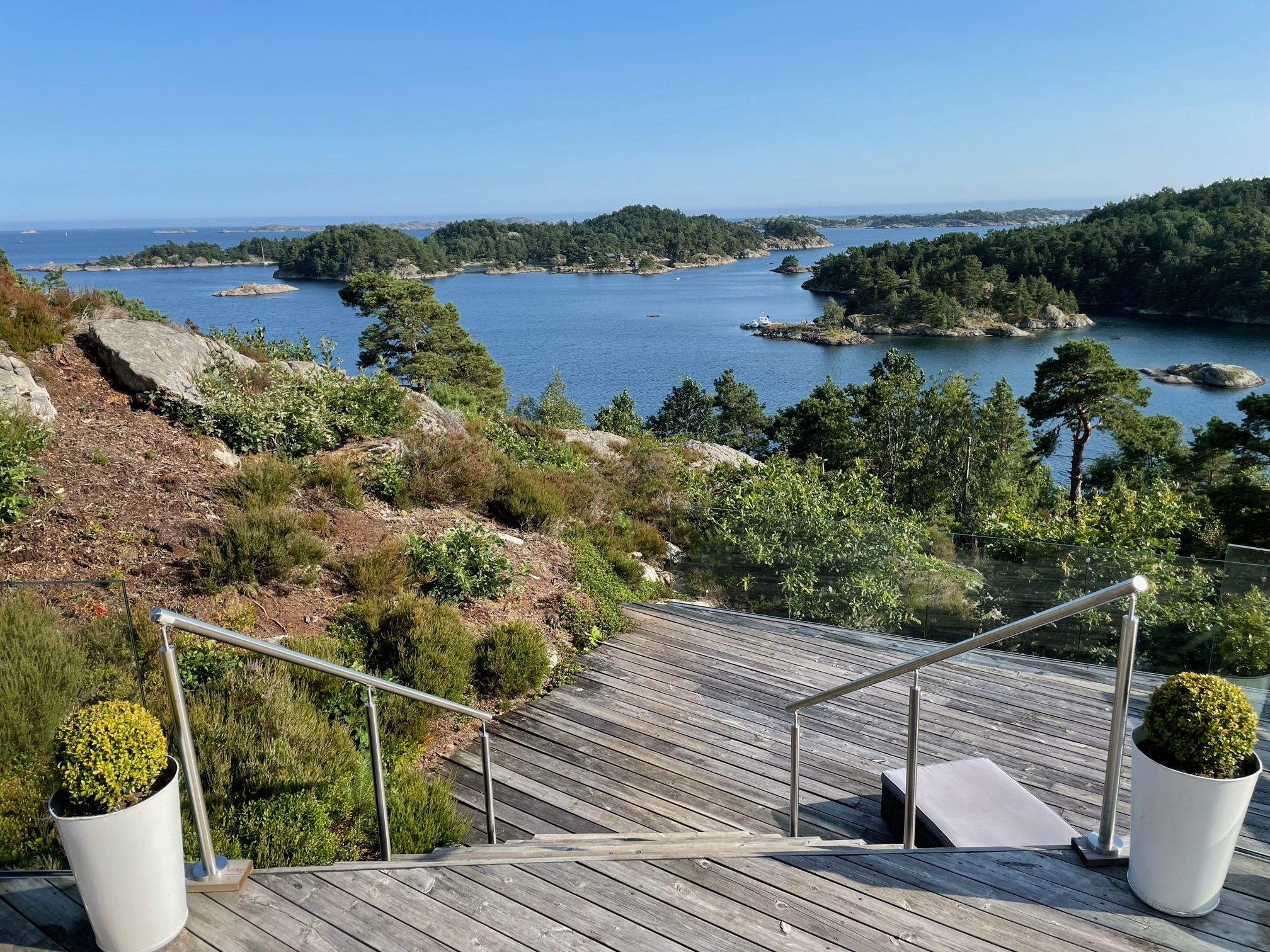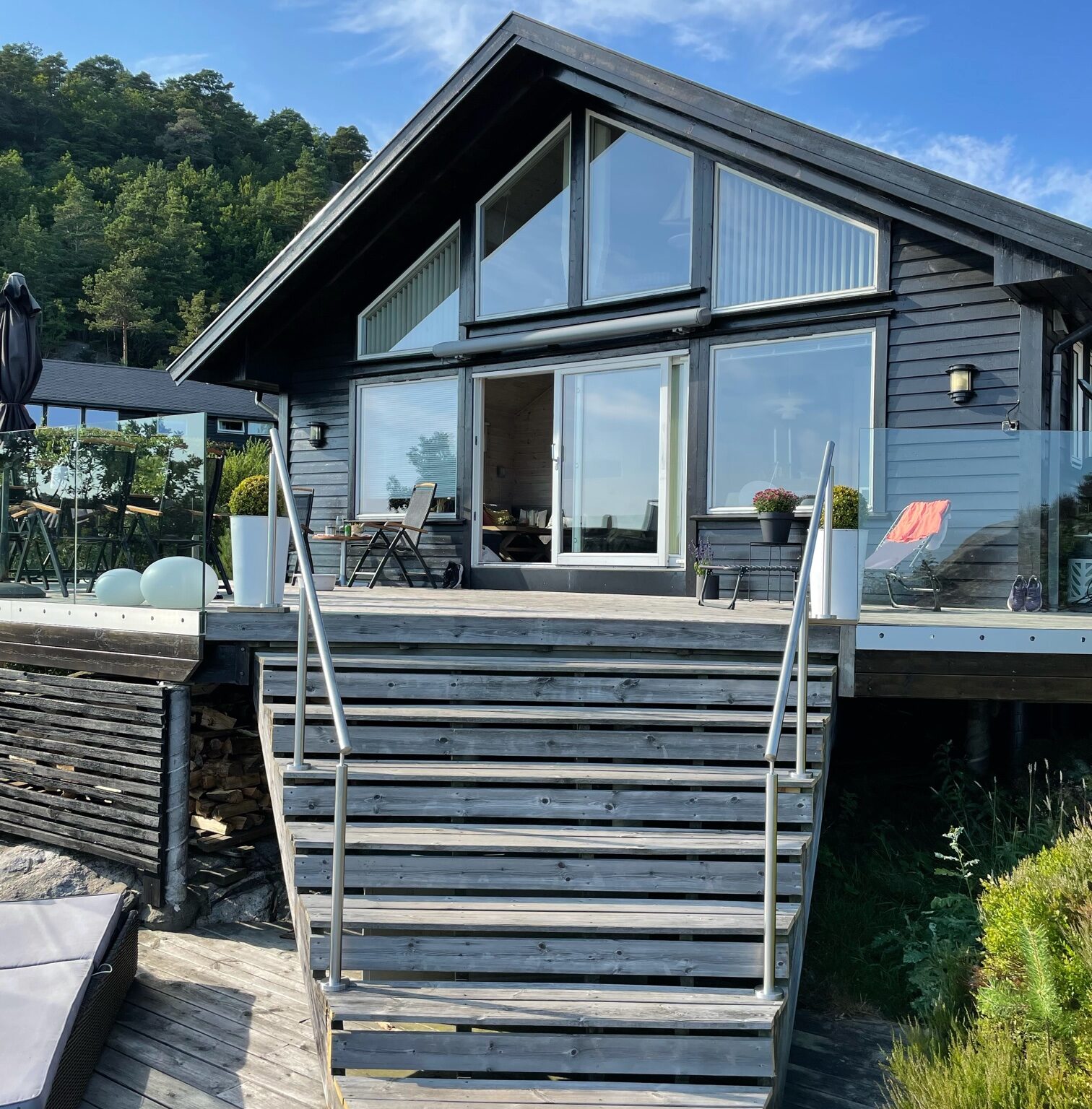 - Post type: Round stainless steel posts with angled base plates for stair installation