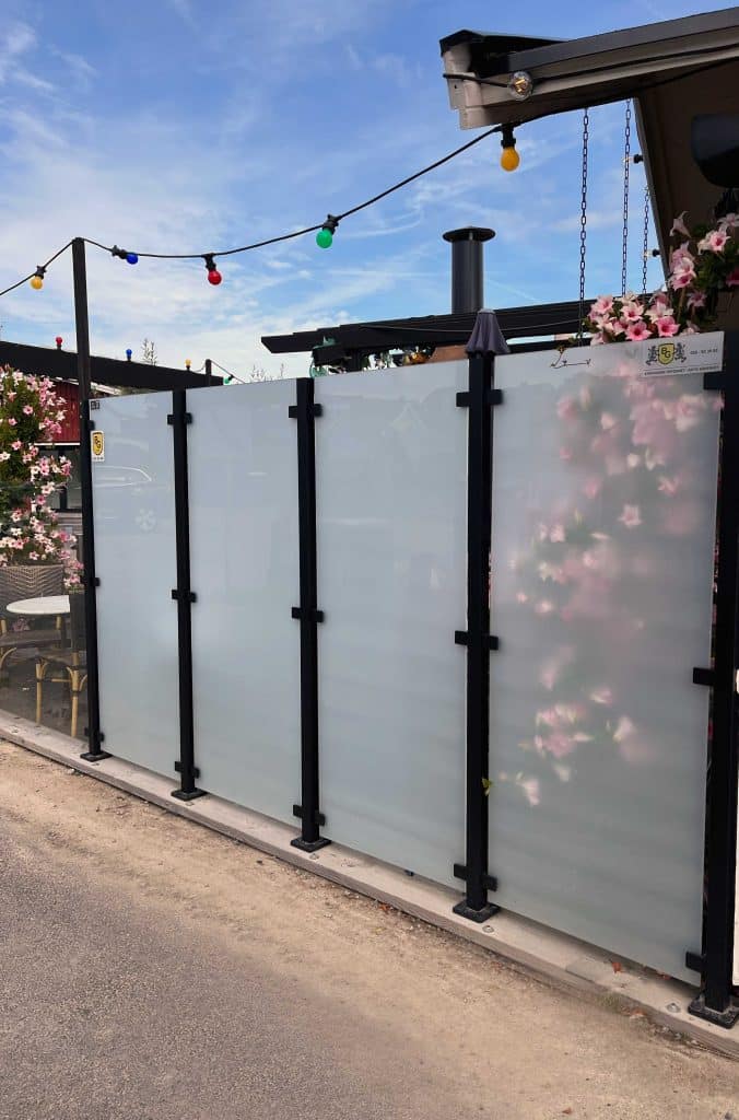 At this restaurant project in Båstad, Balustradedesign supplied a custom version of our Alu Modern glass balustrade – powder-coated in black with extra-high glass panels.